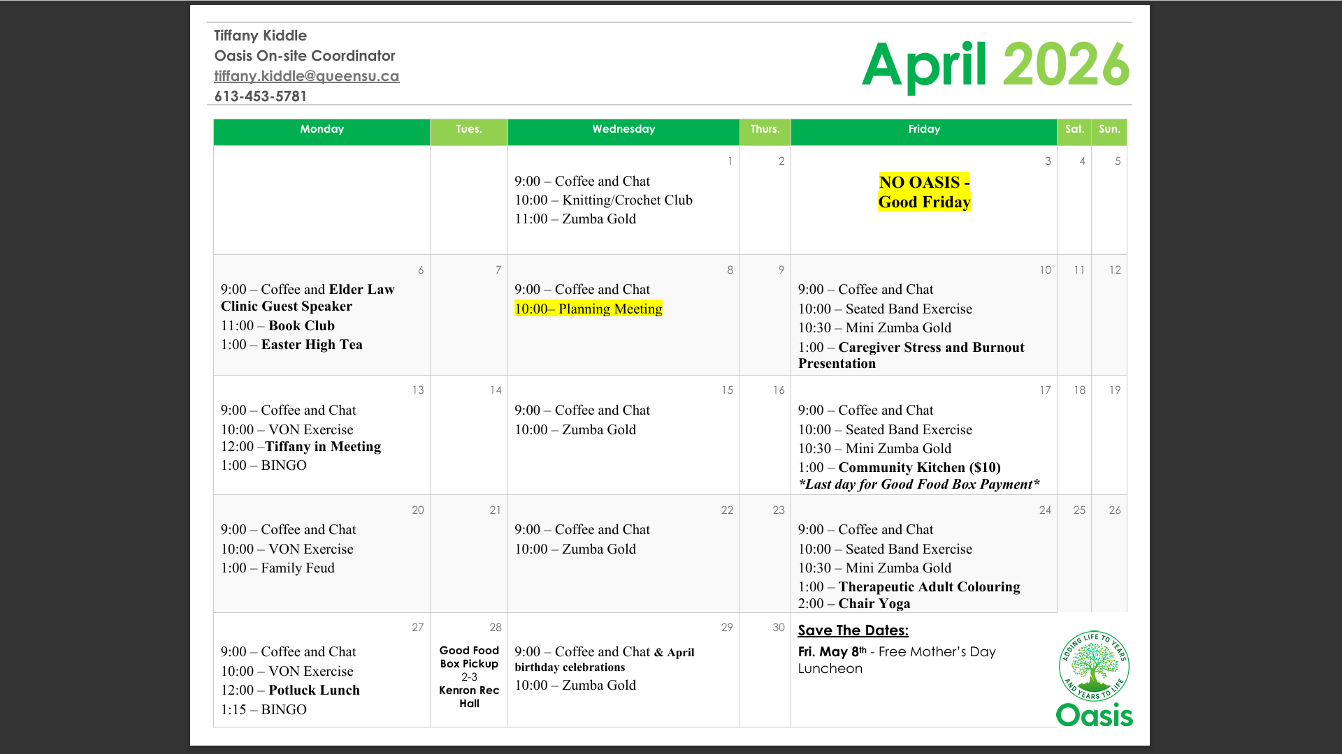 BBQ dates: May 14. 28, Jun 11, 25, Jul 9, 23, Aug 6, 20